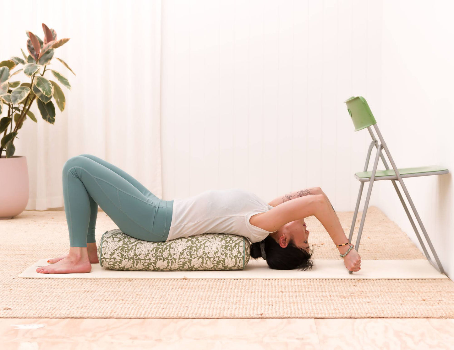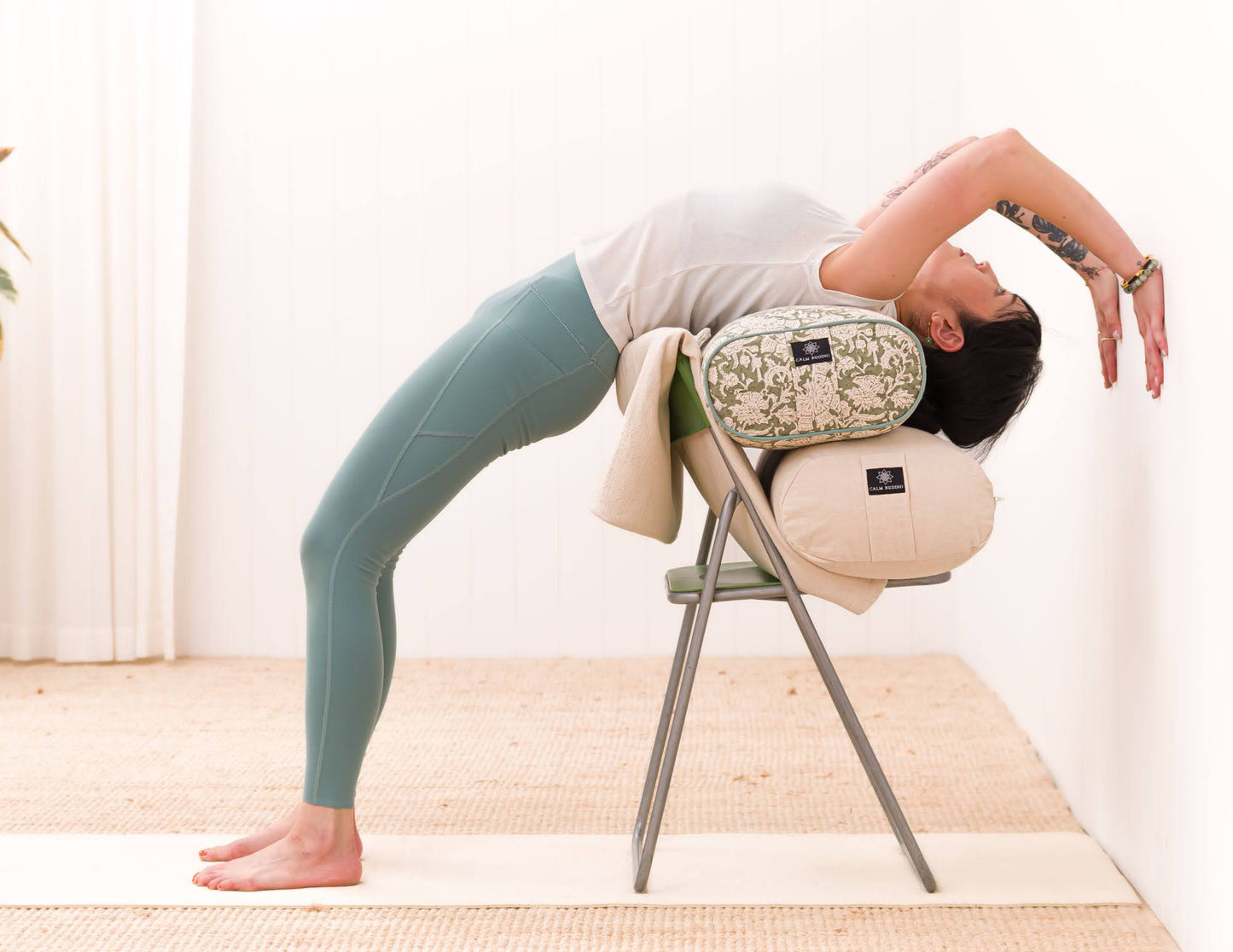 Props Required: 1 × Oval Bolster, 1 × Grounding Yoga Mat, 1 × Chair
