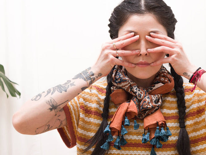 To begin we want to shed some excess tension from the body and mind through breath. Brahmari is a very accessible and fun practice that you do with your kids, nieces, nephews or grandchildren.