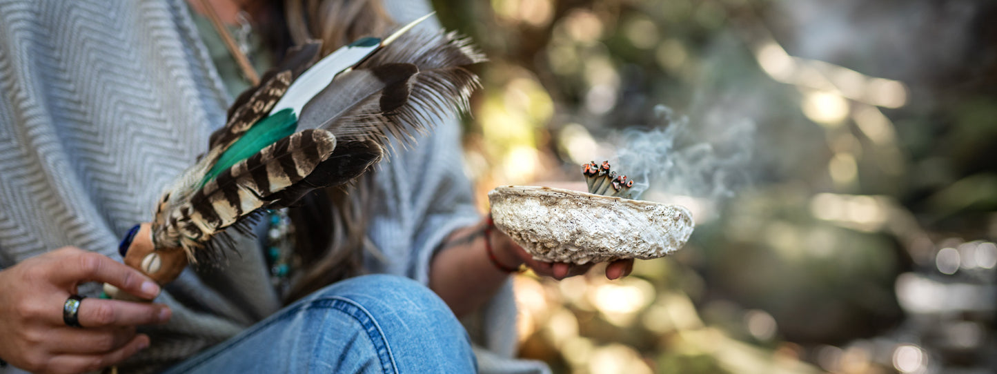 - Light the Sage or Palo Santo with a candle and allow to burn for 30 seconds before blowing out. Use an abalone shell, to bring in the element of water.