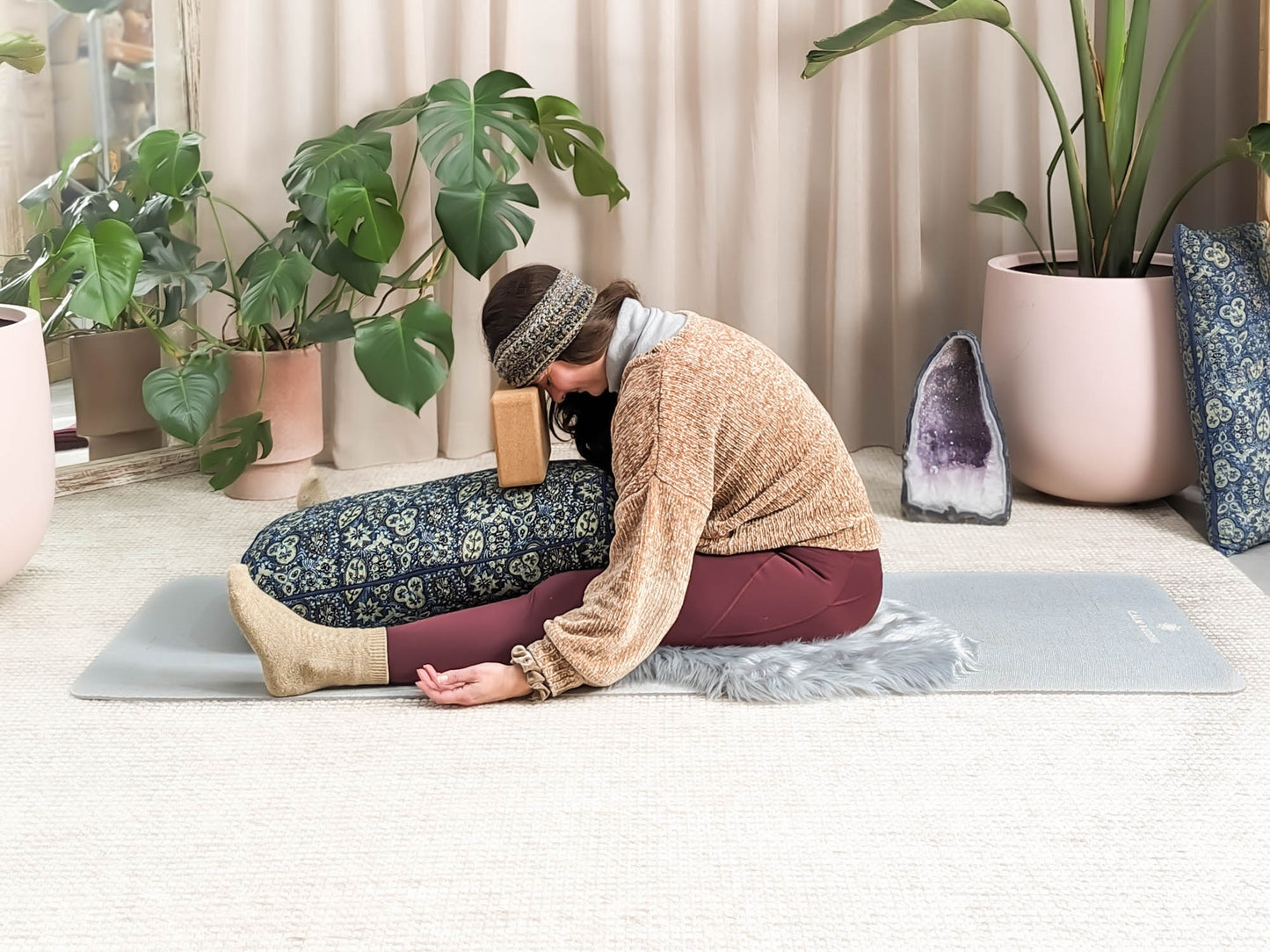 In Yin yoga the intention is to find a comfortable and relaxing edge. Practice with self-kindness and compassion, modify where necessary and use as many props as you need to relax.