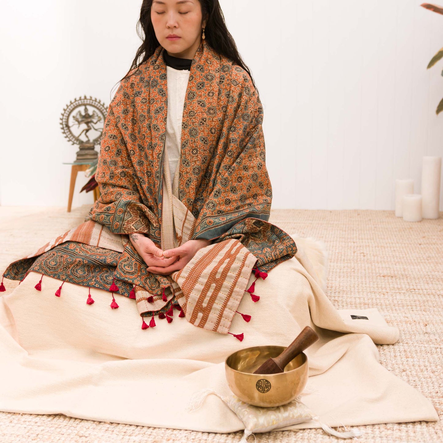 Snuggle up in meditation with a blanket over your legs and a woolen or woolen silk double sided shawl over your head and shoulders. Close your eyes and turn inwards, tuning out of the worries of the world outside.