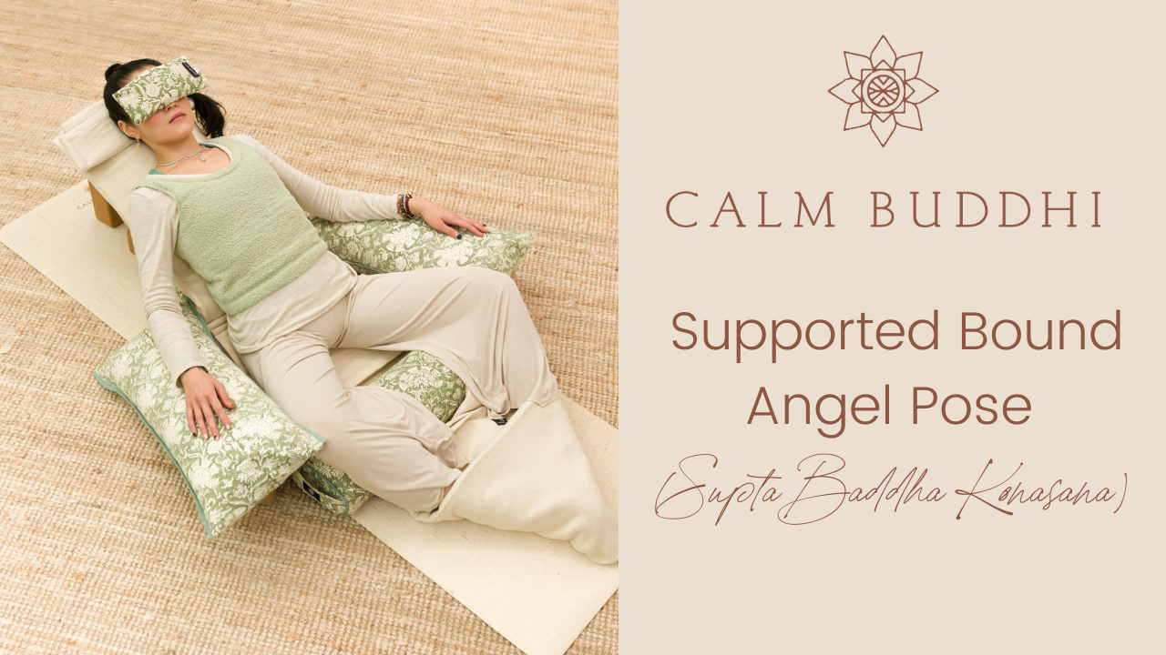 | Supported Bound Angel | Oval Yoga Bolster, Yoga Pillow, Blankets, Eye Pillow and Cork Yoga Block |
