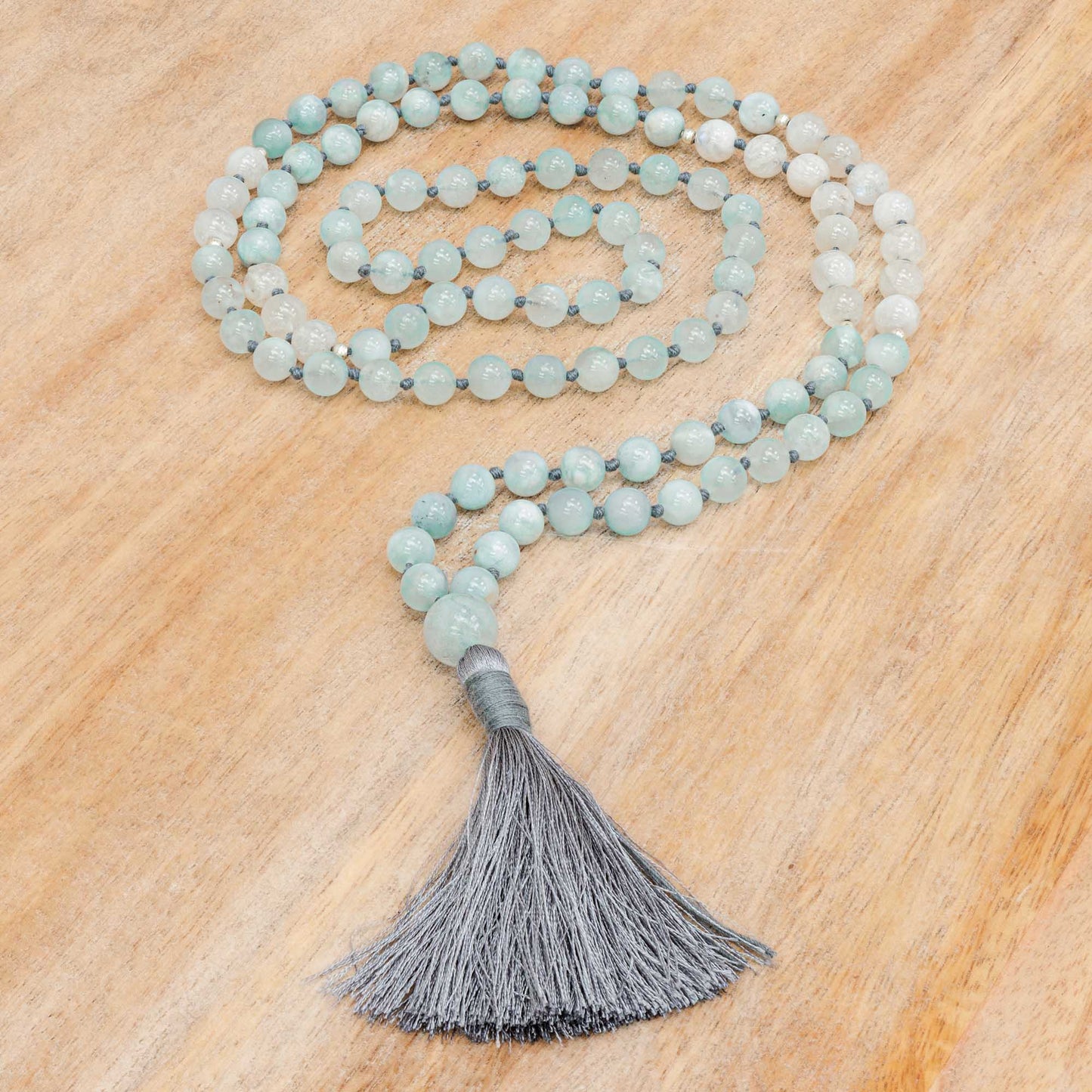 Elevate your meditation practice with our handmade Aquamarine and Moonstone meditation mala meticulously strung with authentic gemstones known for their potent energies. Each bead is a tactile reminder to channel your mind to a mantra and find peace of mind.