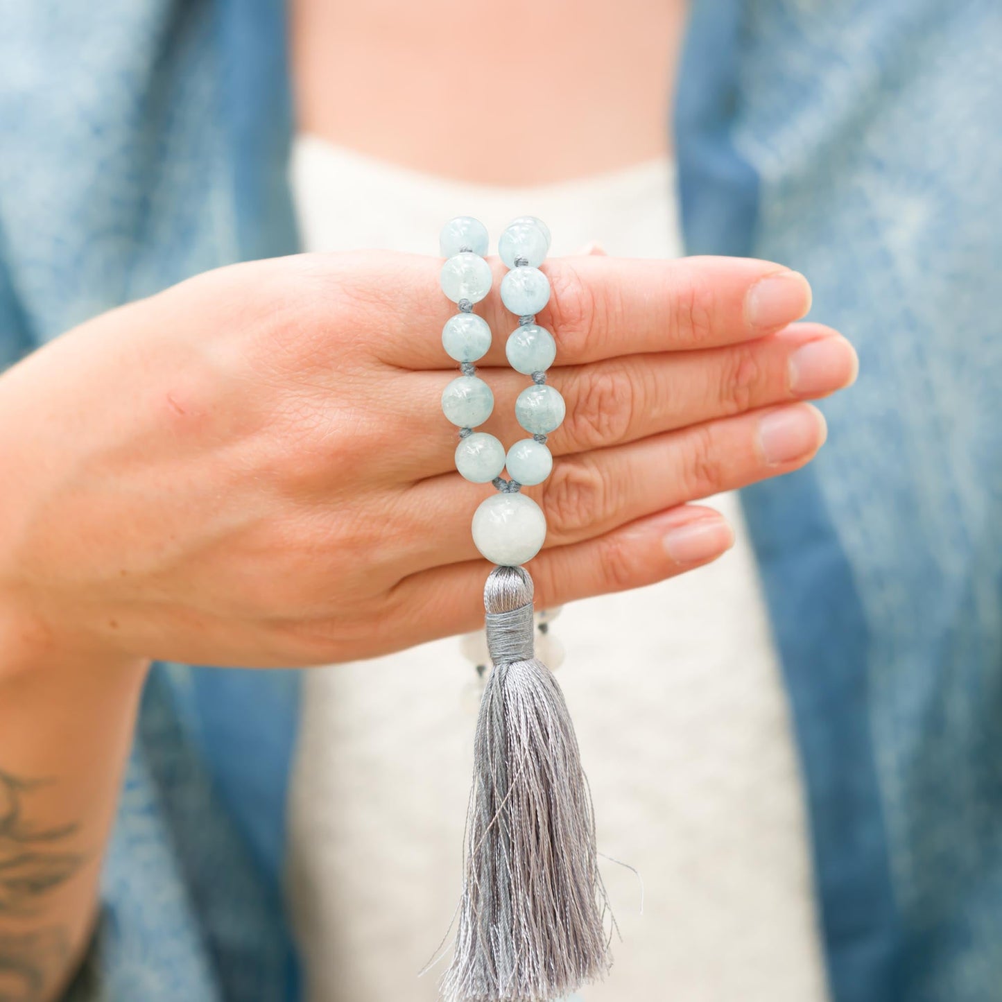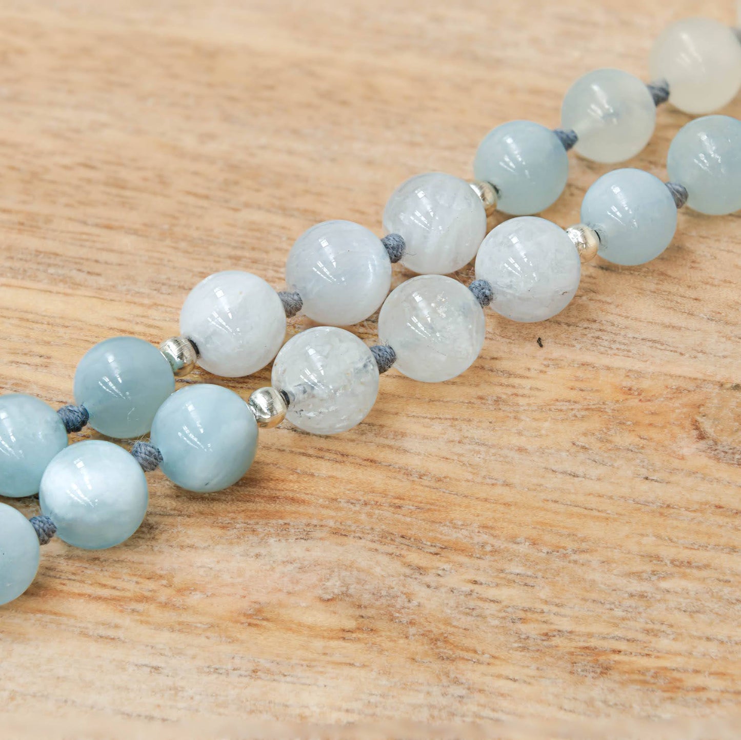 This AQUAMARINE and MOONSTONE meditation mala was created so the courageous and calm energy of Aquamarine and the cooling, nurturing properties of Moonstone could support you in life and in your japa mala meditation practice.