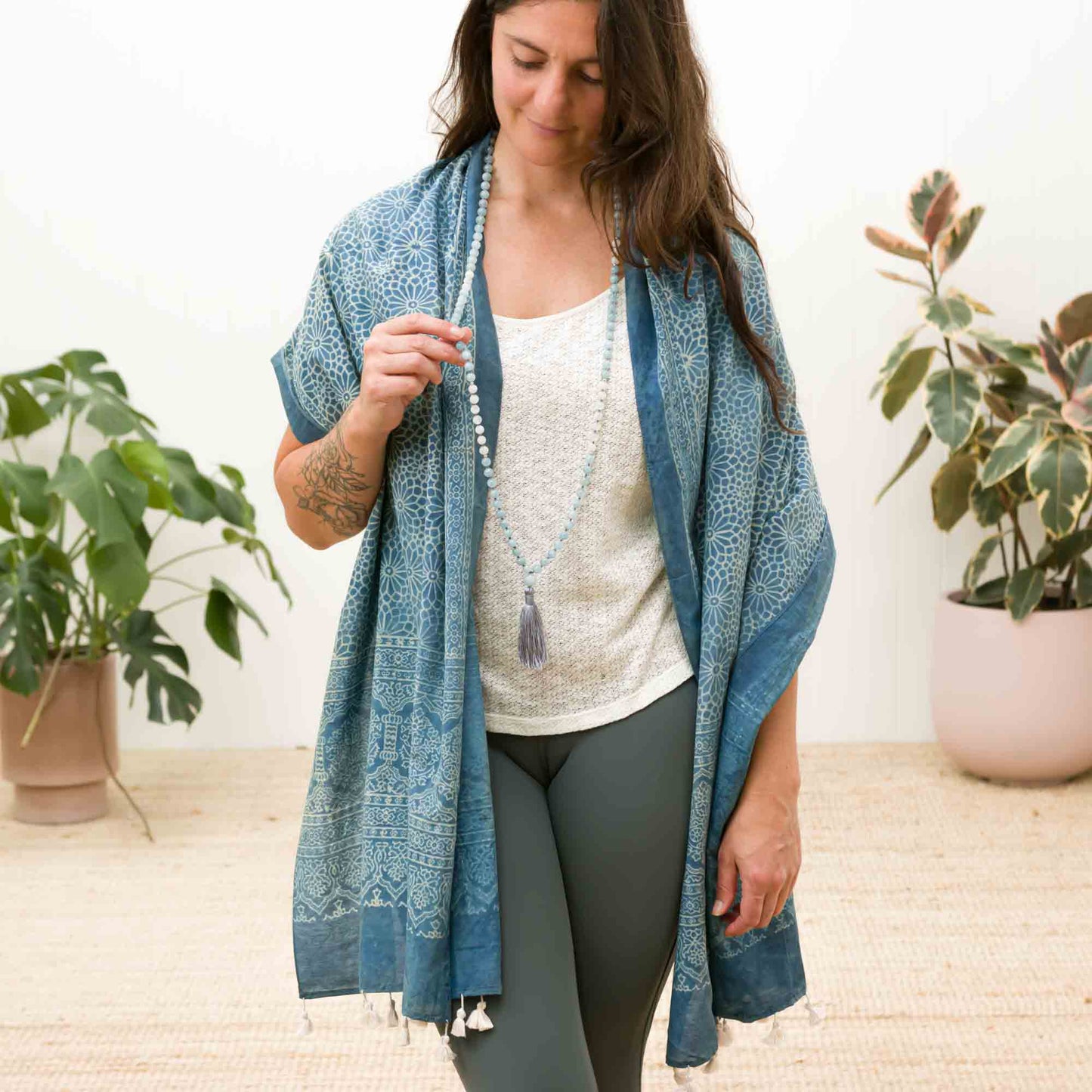 Paired with the mala is an Indigo Star hand-block printed natural dye cotton-silk scarf designed to envelop you in comfort during your meditation sessions or whenever you need a moment of respite. The scarf not only contains the energy while you meditate but also adds a piece of art to your wardrobe.
