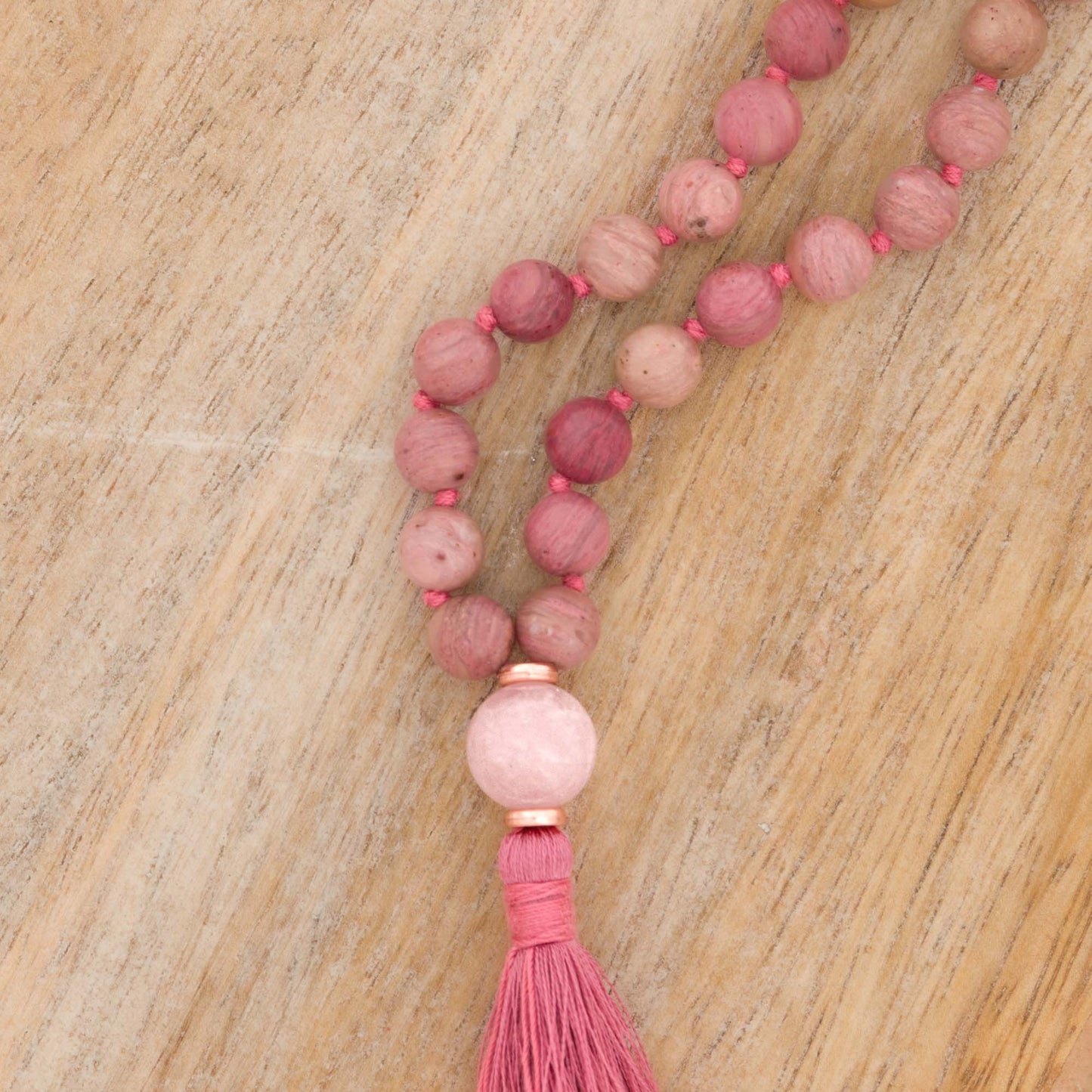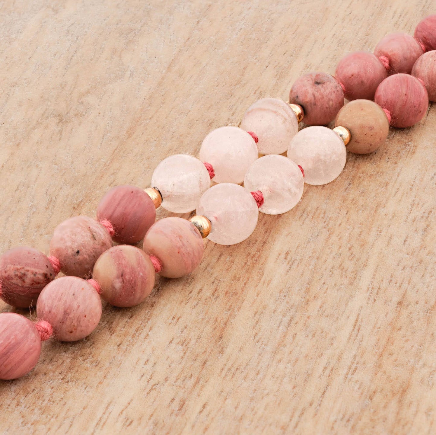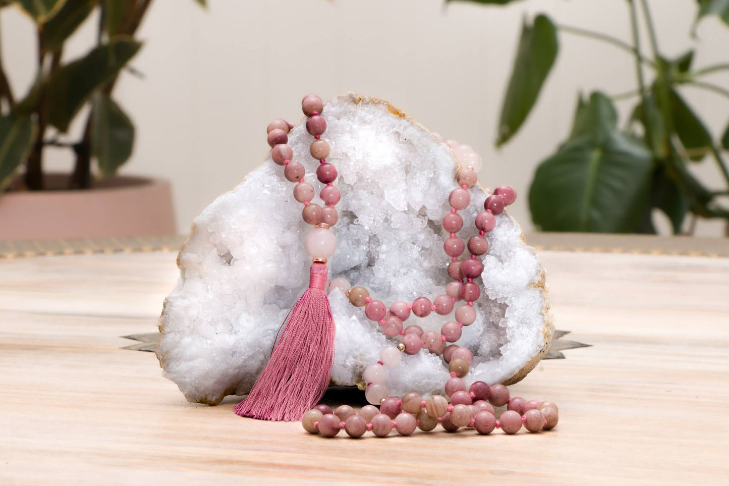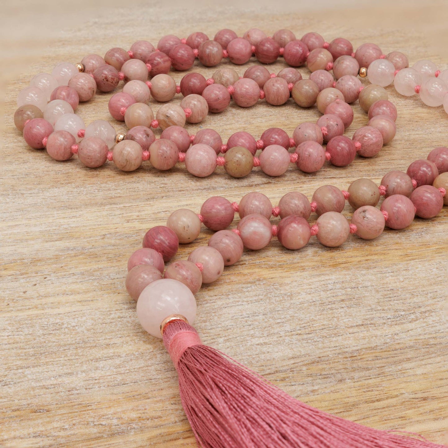 Elevate your meditation practice with our handmade Rose Quartz and Rhodonite meditation mala meticulously strung with authentic gemstones known for their potent energies. Each bead is a tactile reminder to channel your mind to a mantra and find peace of mind.