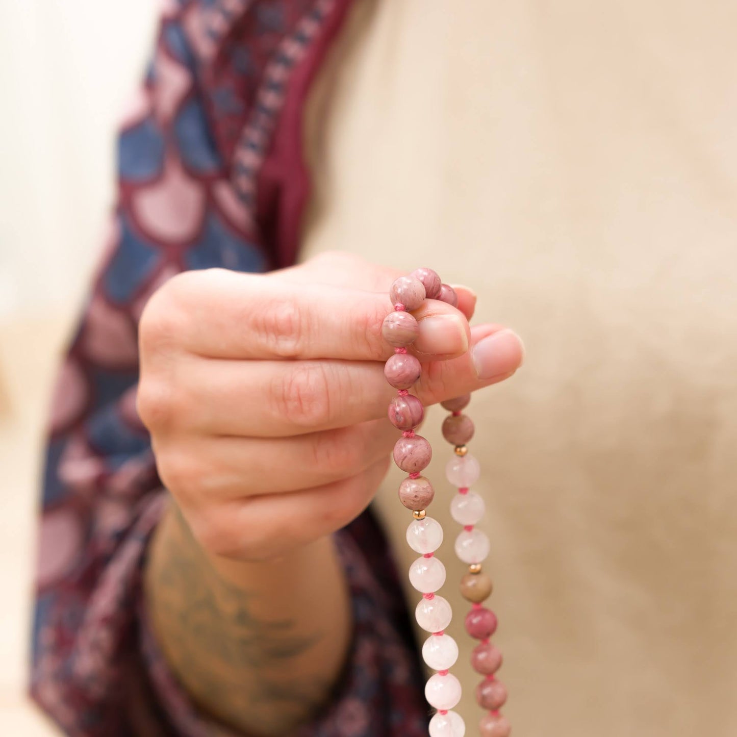 This ROSE QUARTZ and RHODONITE mala necklace was created so the grounding and stabilising of rhodonite and the loving energy of Rose Quartz could support you in life and through your japa mala meditation practice.