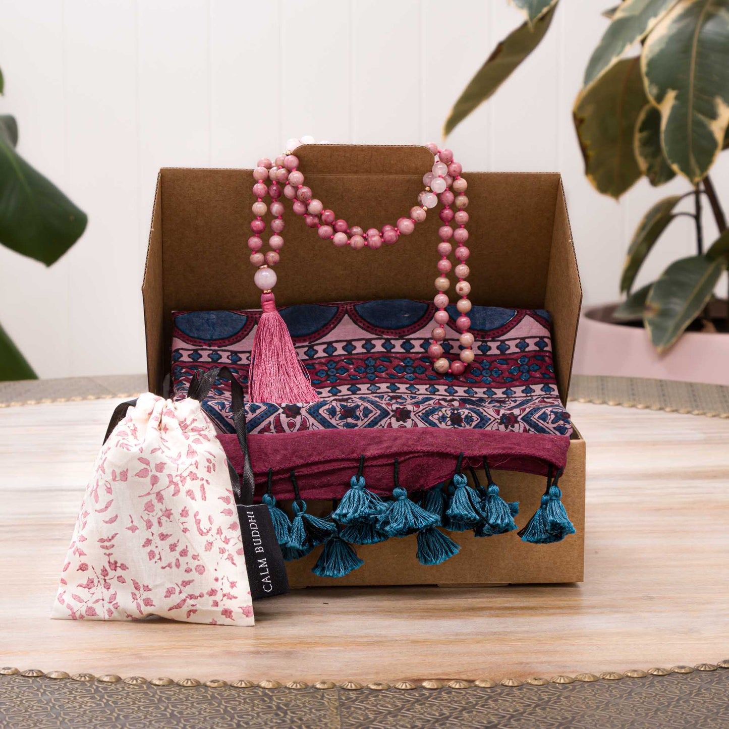 Paired with the mala is a Dusky Rose hand-block printed natural dye cotton-silk scarf designed to envelop you in comfort during your meditation sessions or whenever you need a moment of respite. The scarf not only contains the energy while you meditate but also adds a piece of art to your wardrobe.