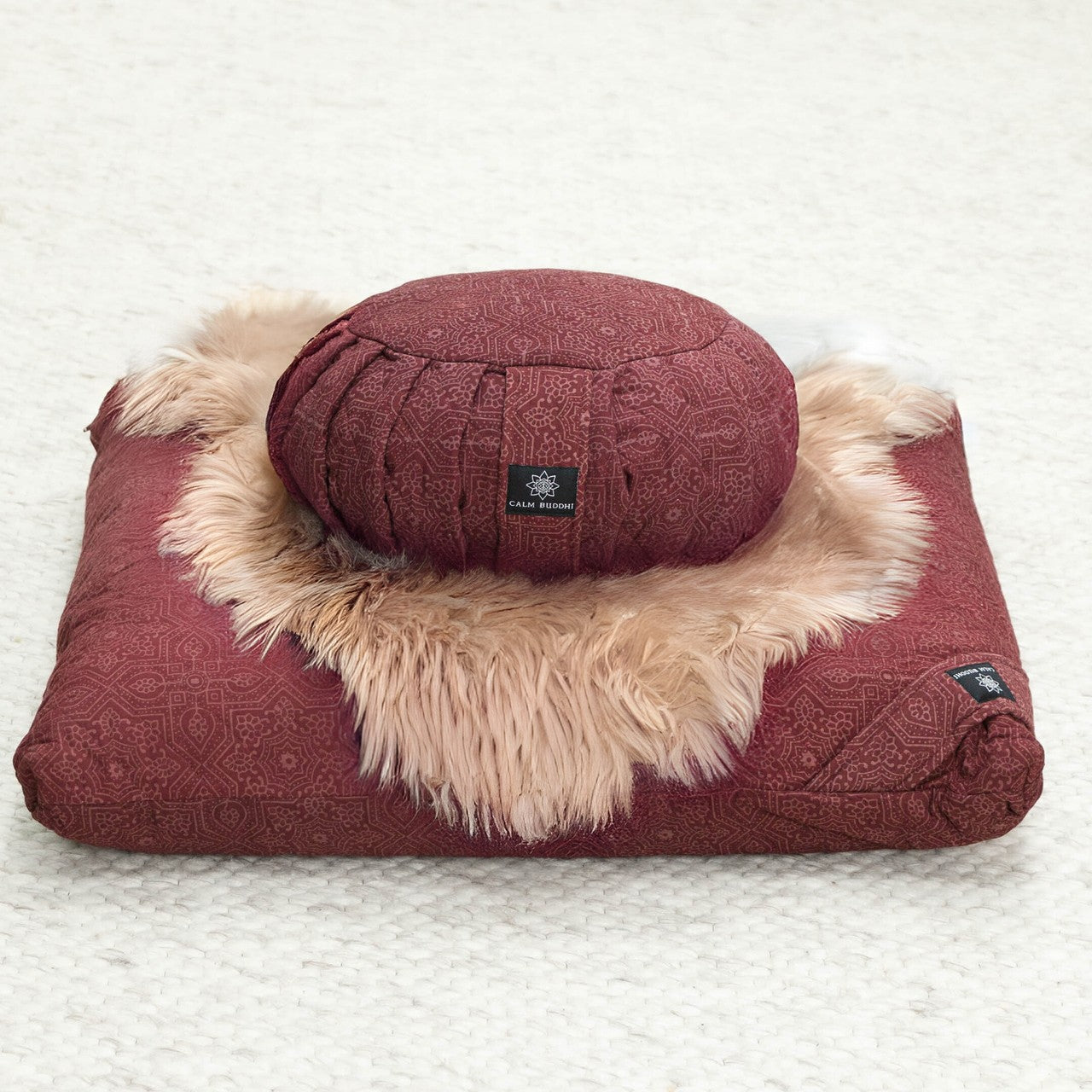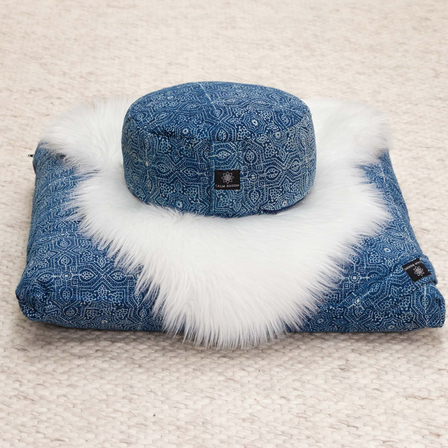 The Zafu (round meditation cushion) and Zabuton (large square cushion) is a traditional set that elevates your sit bones and when sitting on the front edge allows for a gentle tilt in the pelvis. This allows for the spine to rise up whilst also allowing space for the knees to descend lower than the hips. The Zabuton gives your knees and ankles a soft landing and grounding for your meditation practice.