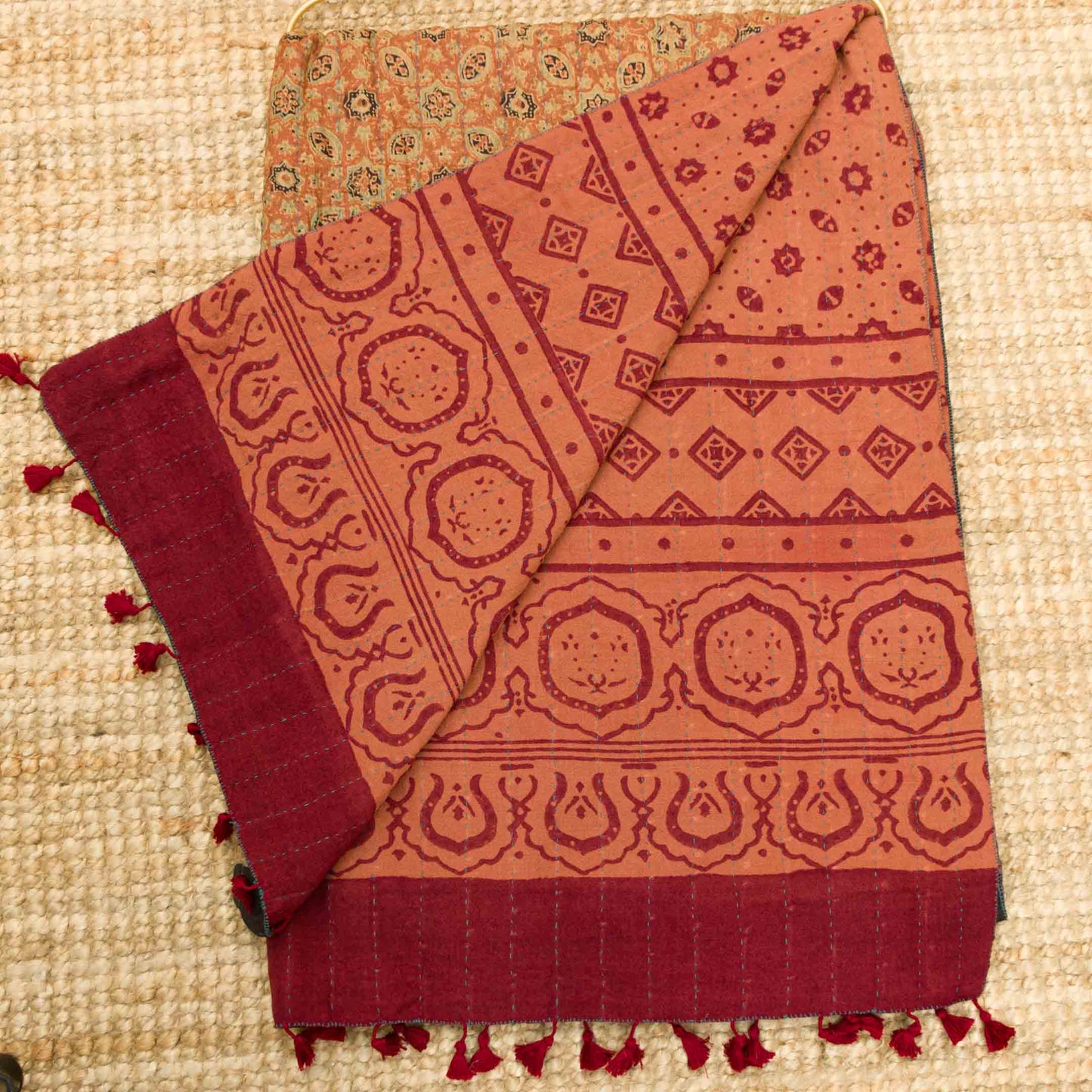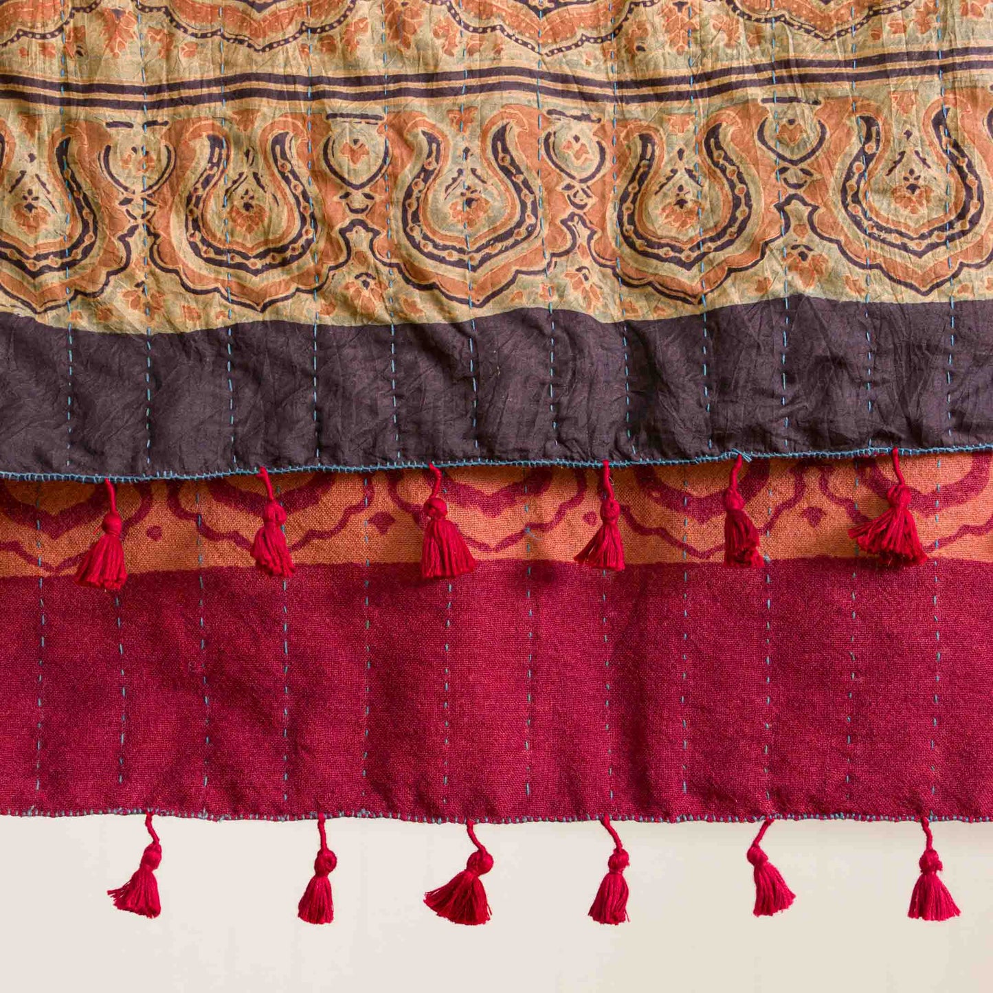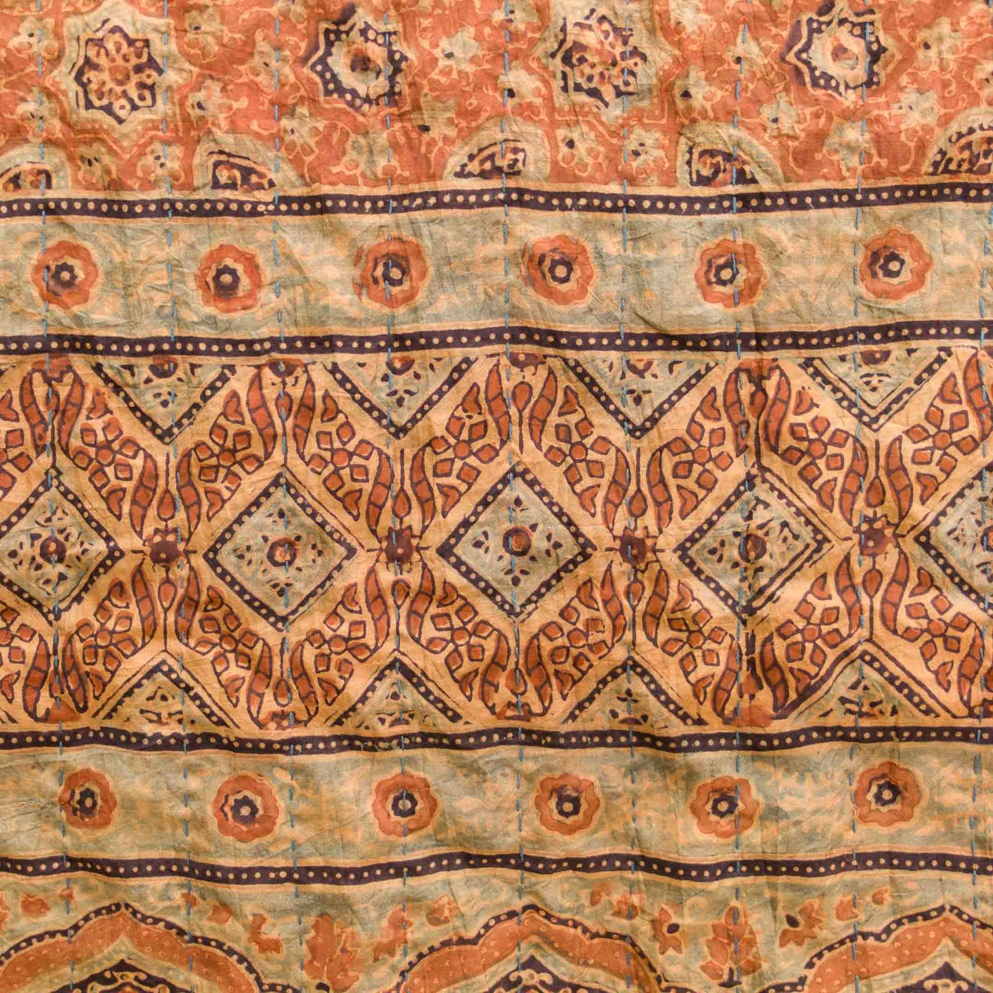 Layered in block-printed patterns using 19 hand carved blocks indigo, madder and alizarin.
