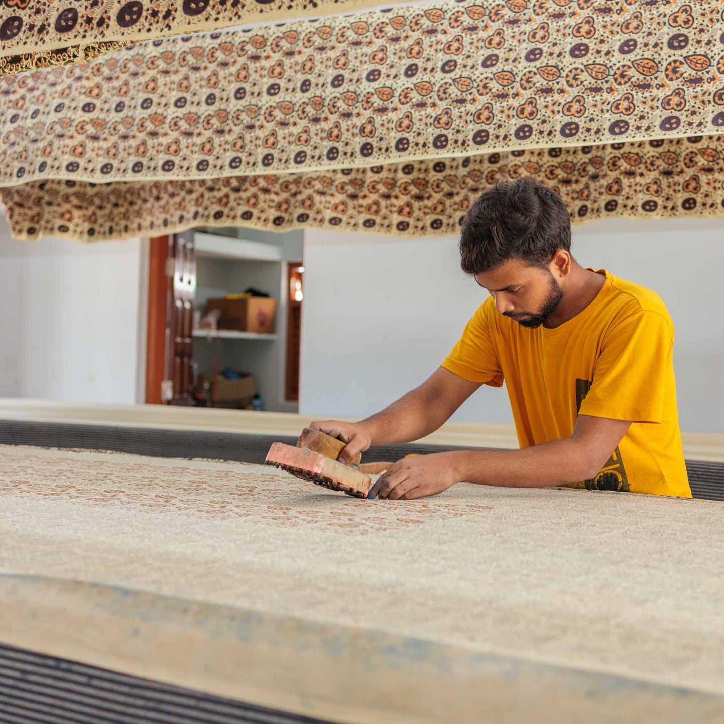 Our highly skilled artisan printers use three hand-carved blocks, layered with precision, to bring intricate details to life in this stunning design.