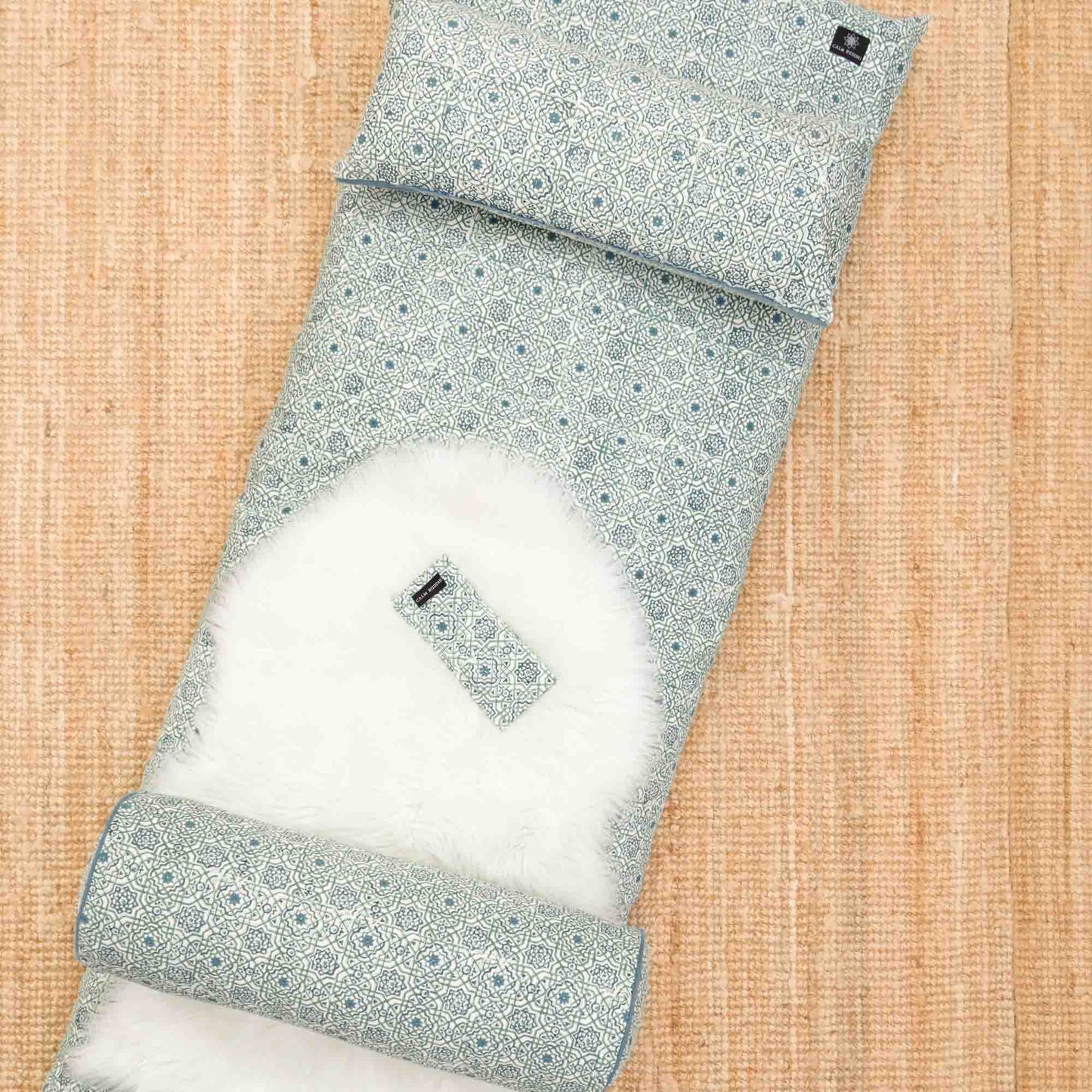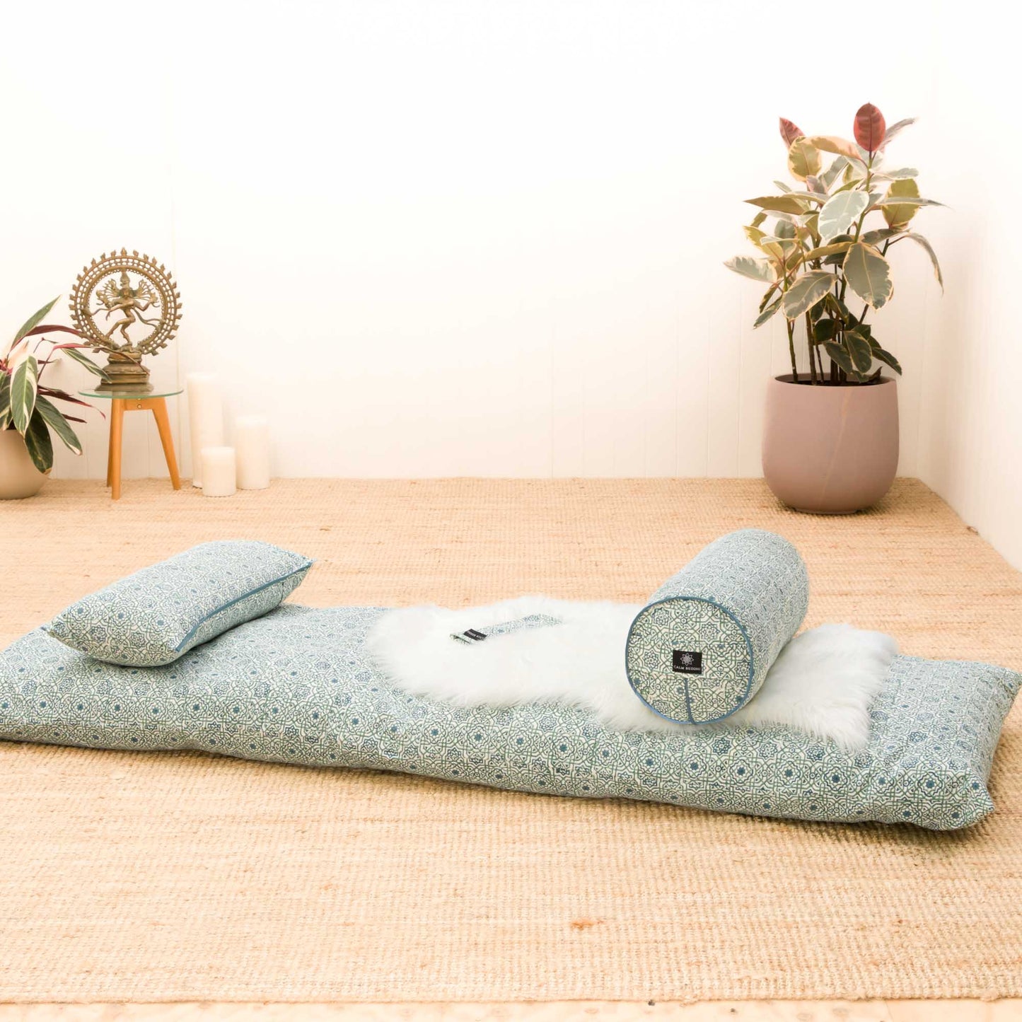 Hand block printed with global organic standard dyes on soft organic cotton our Holly props will soothe you into your practice.