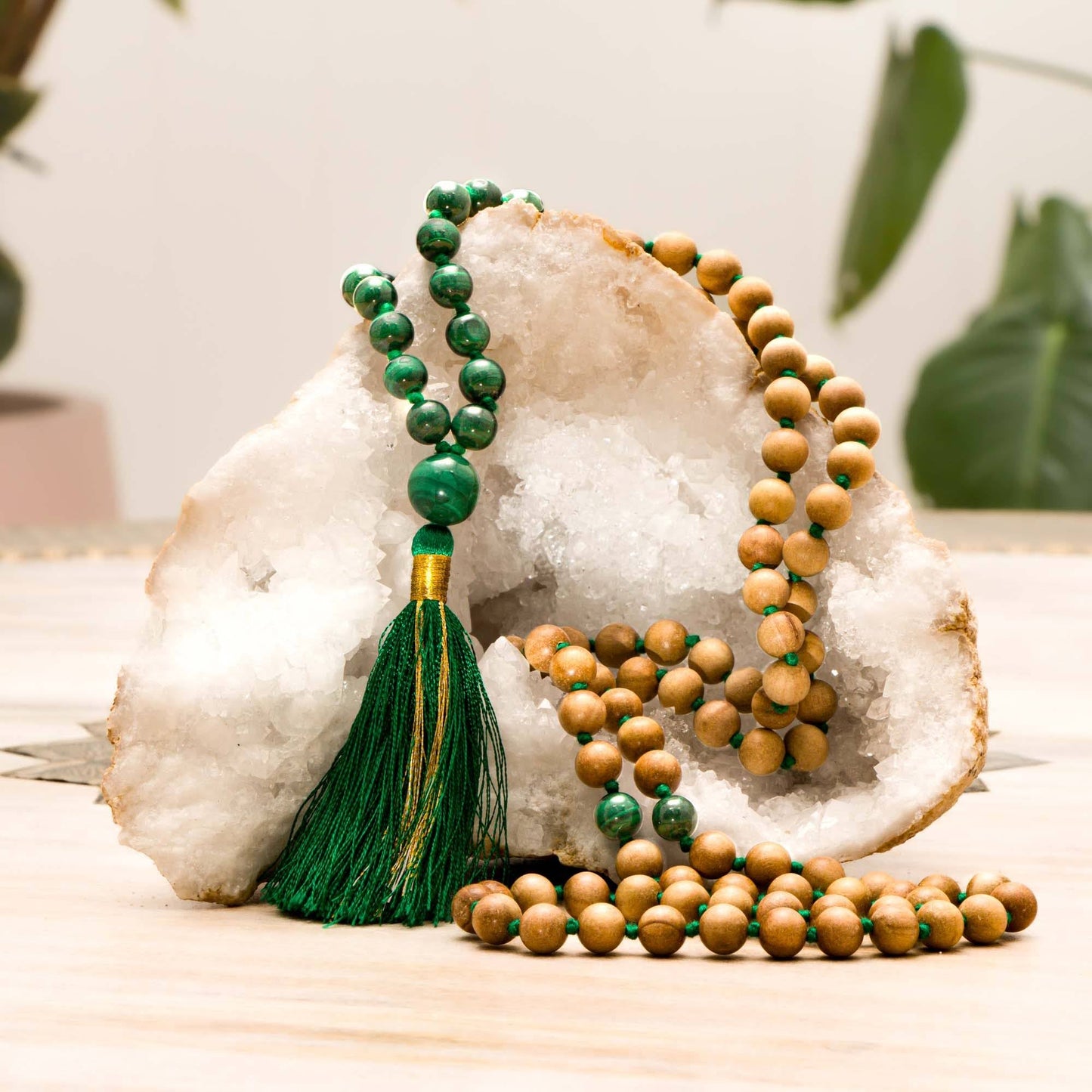 This powerful combination of MALACHITE and SANDALWOOD mala necklace was created using the stabelising and calming energy of sandalwood and the strong loving energy of malachite to support you in life and through your japa mala meditation practice.