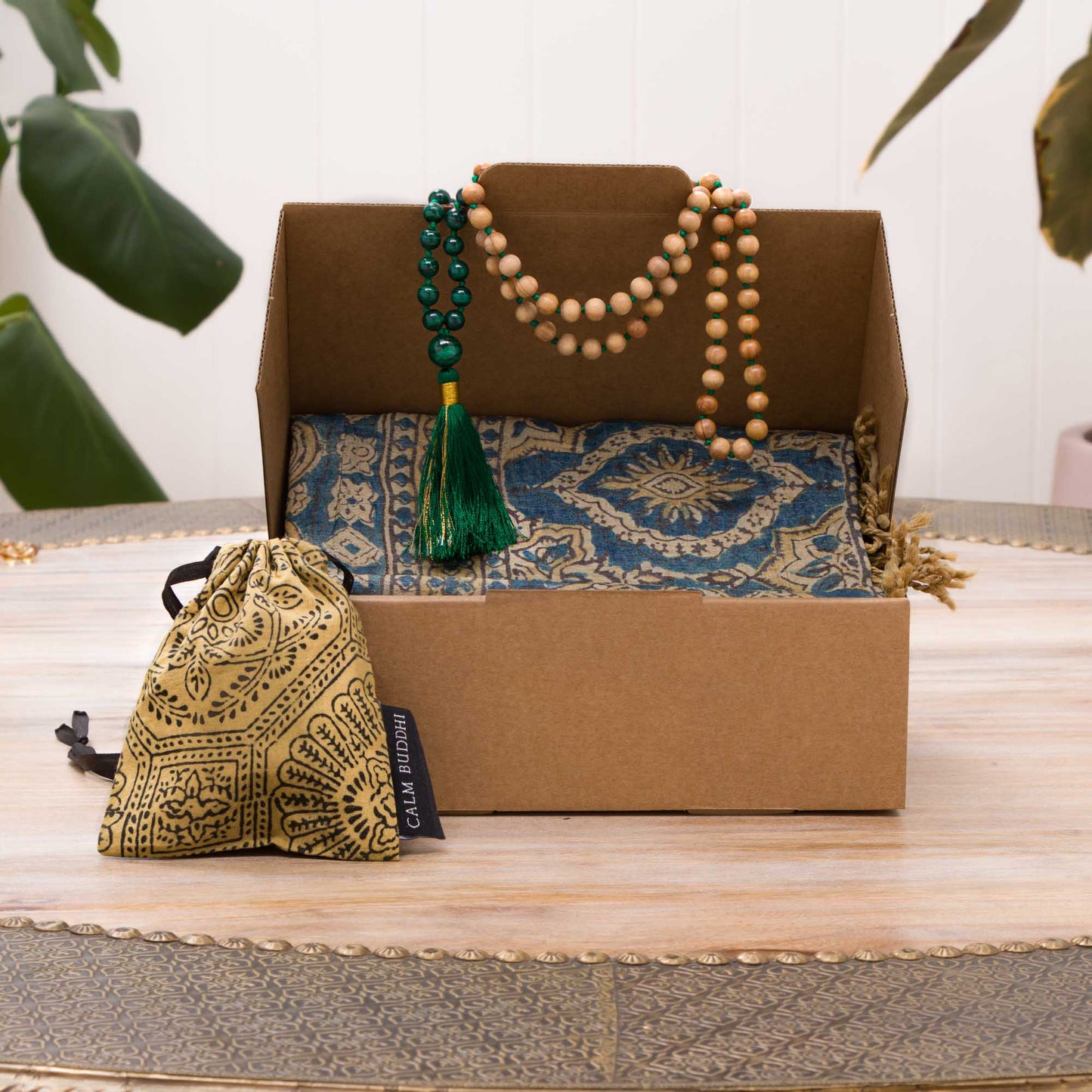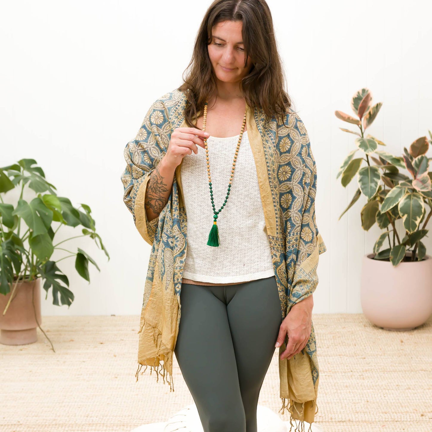 Paired with the mala is a Dhvadi Flower hand-block printed natural dye tussar-silk scarf designed to envelop you in comfort during your meditation sessions or whenever you need a moment of respite. The scarf not only contains the energy while you meditate but also adds a piece of art to your wardrobe.