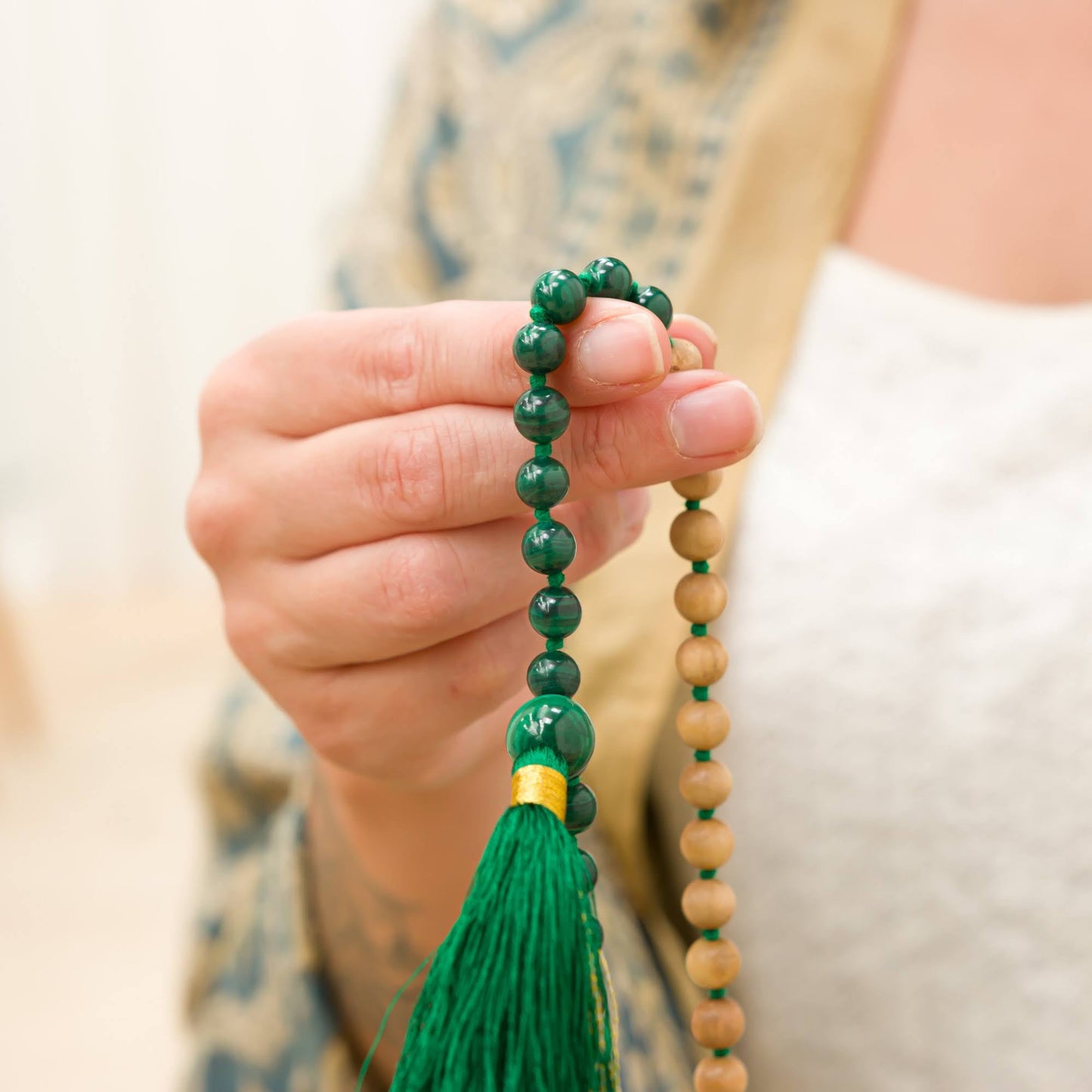 Elevate your meditation practice with our handmade Malachite and Sandalwood meditation mala meticulously strung with malachite gemstones and sandalwood known for their potent energies. Each bead is a tactile reminder to channel your mind to a mantra and find peace and anchor the mind.