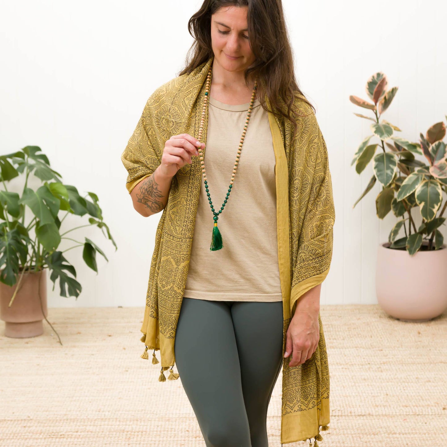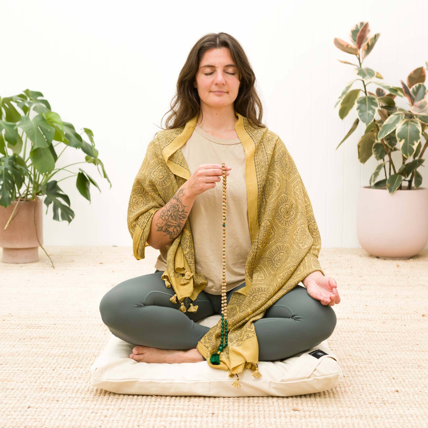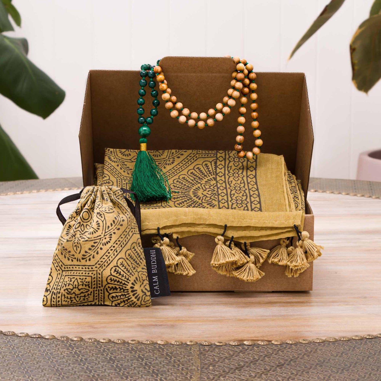 Paired with the mala is a Mustard Flower hand-block printed natural dye cotton-silk scarf designed to envelop you in comfort during your meditation sessions or whenever you need a moment of respite. The scarf not only contains the energy while you meditate but also adds a piece of art to your wardrobe.