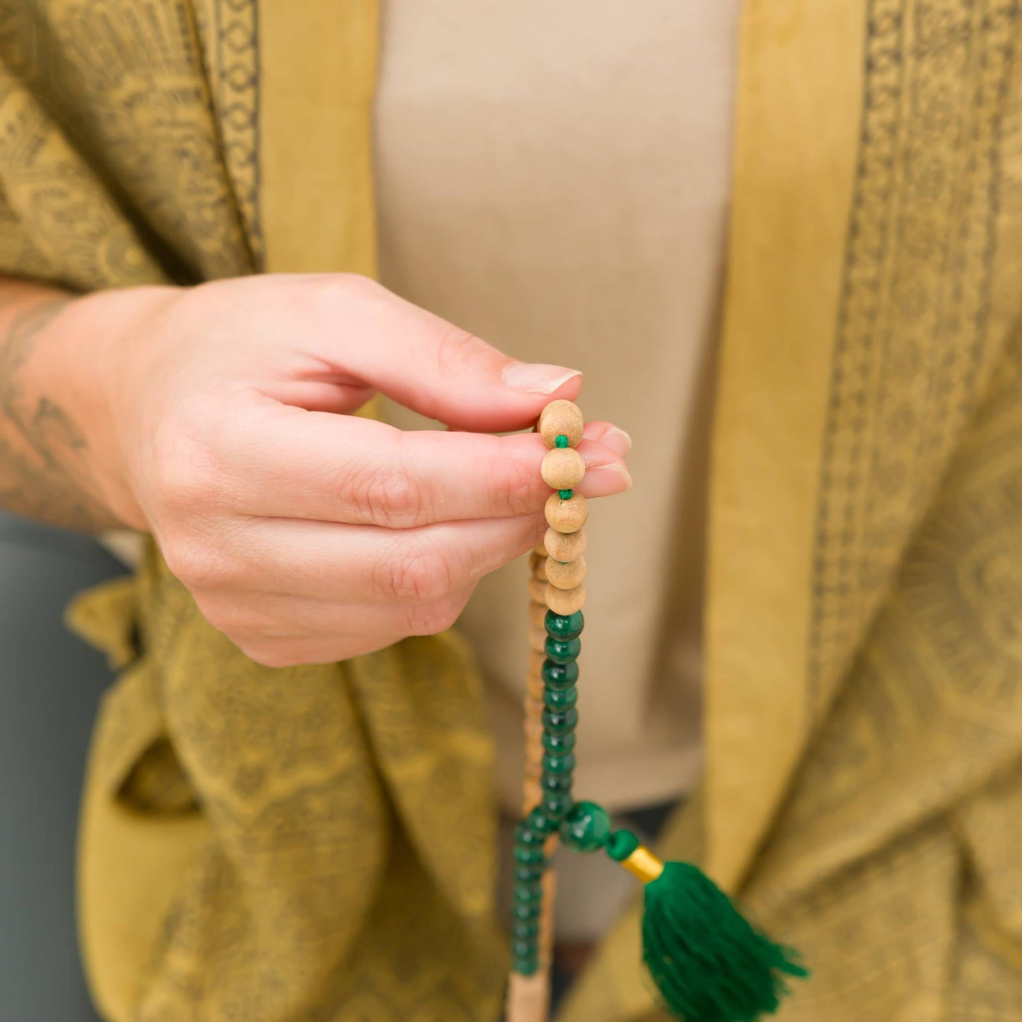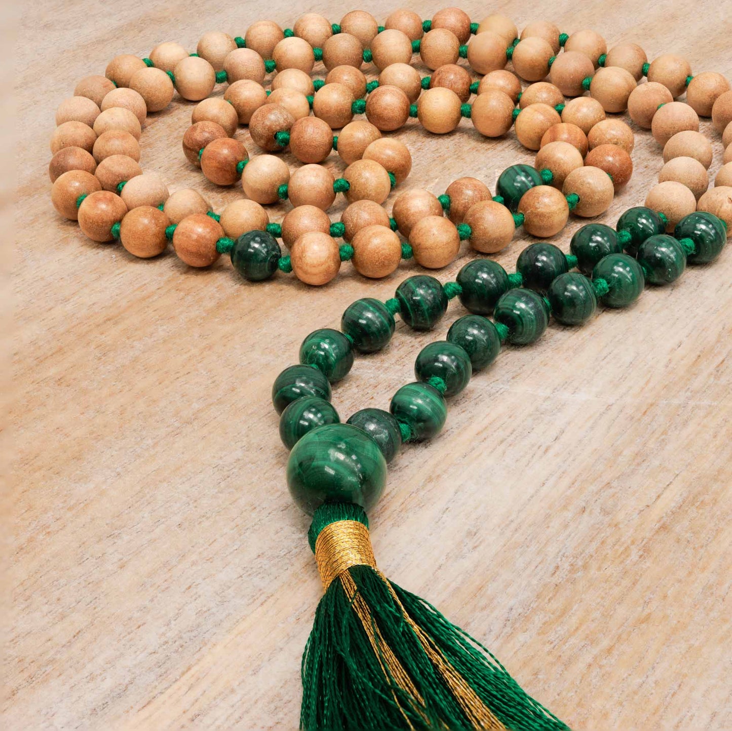 Elevate your meditation practice with our handmade Malachite and Sandalwood meditation mala meticulously strung with malachite gemstones and sandalwood known for their potent energies. Each bead is a tactile reminder to channel your mind to a mantra and find peace and anchor the mind.
